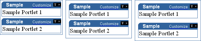 The following examples show the same region with different portlet spacing. In the first example the space around portlets is set to 4 pixels and the space between portlets is set to 6. In the second example, the space around portlets has been changed to 10 pixels. In the final example the space between portlets has been changed to 15 pixels.