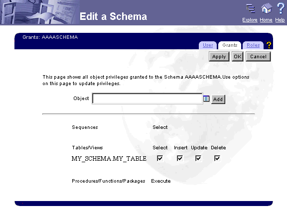 The Grants page updates with the name of the object you just added plus checkboxes for granting or revoking privileges. In the example below, Select, Insert. Update, and Delete privileges are being granted on the MY_TABLE object to the Oracle database user AAAASCHEMA. MY_TABLE is currently stored in a schema called MYSCHEMA.