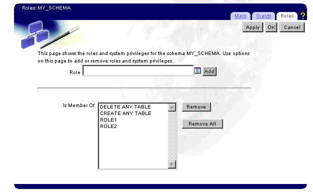 Click the Roles tab. The Roles tab displays all roles and database system-level privileges for the schema. In the following example, MY_SCHEMA is a member of the ROLE1 and ROLE2 roles, and has the CREATE ANY TABLE and DELETE ANY TABLE system-level database privileges.