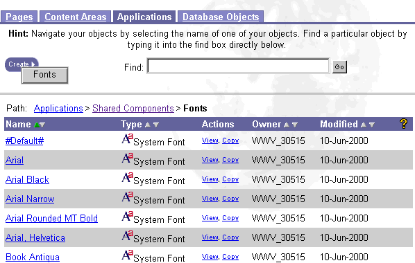 In the Oracle Portal Navigator, navigate to the list of fonts.