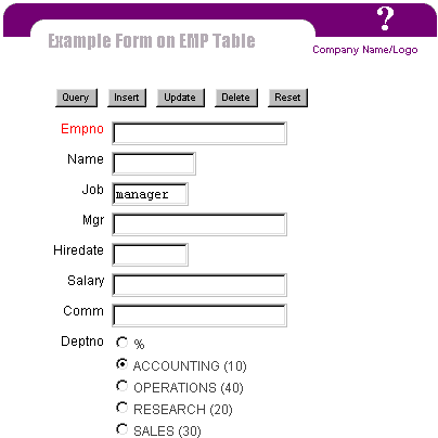 The form that displays would contain Clark as a default value in the Name entry field. Or you could specify DEPTNO:JOB in P_ARG_NAMES, and 10:MANAGER in P_ARG_VALUES to display the following form. Note that manager and Accounting (10) are selected in this form by default.