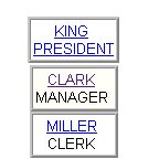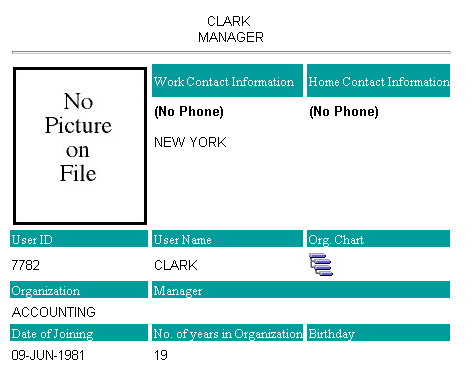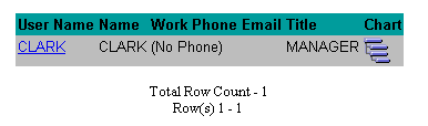 The User Name CLARK and the Chart icon are both both hypertext links to another report containing details about Clark and a hierarchy database portlet, respectively. The hierarchy shows Clark's position in an organization chart. Both database portlets are shown below