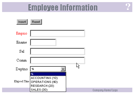 For example, an Oracle Portal developer could create a form that allows end users to update the DEPTNO column in the SCOTT. EMP table. The developer could add a List of Values to this form that allows end users to select either Accounting, Operations, Research, or Sales, to update the DEPTNO column.
